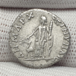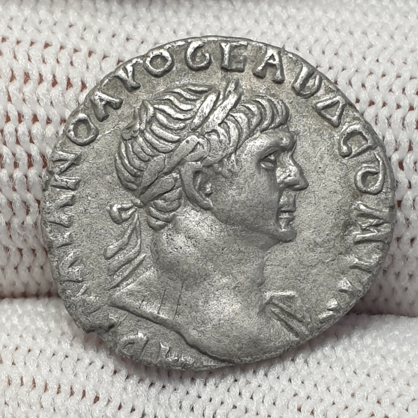 laureate head of Trajan, right, with drapery on left shoulder