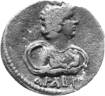 bust of Arabia, right, wearing turreted crown and mantle blown out by the wind; in each arm, she holds a small figure of seated child