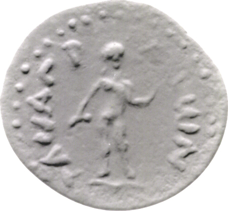Apollo (?) naked, standing facing, holding bow (?) in his right hand, his left hand raised