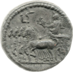 Emperor (Trajan) standing in quadriga, left, laureate-headed, wearing toga, holding eagle-tipped sceptre and branch