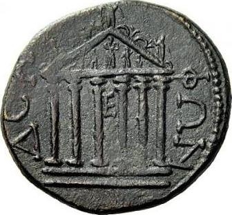 temple with six columns of Apollo; Ε between the central columns; figures in the pediment, on the centre and corners of the roof