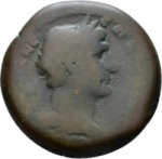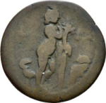 Harpocrates standing, right, raising finger to lips; (to left, ram; to right, cornucopia on column, and altar surmounted by lotus flower (?)