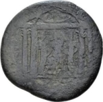 temple (classical) with four columns enclosing Sarapis seated, left, to left, Demeter standing, right, holding torch; to right, Tyche (?) standing, left, holding cornucopia