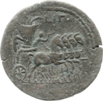 kalathos and small figure with whip in quadriga of horses, right; behind, female figure
