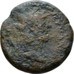 Helios, radiate, riding on horse, left, raising arm and holding sceptre