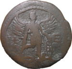Dattari described the figure as ‘Tyche (Fortuna?)’; but see year 13 (the problem of 4414.2). He also says the figure is standing on a thunderbolt, and that it is a ‘testa di Zeus?’ at her feet. It looks more like a prostrate body?