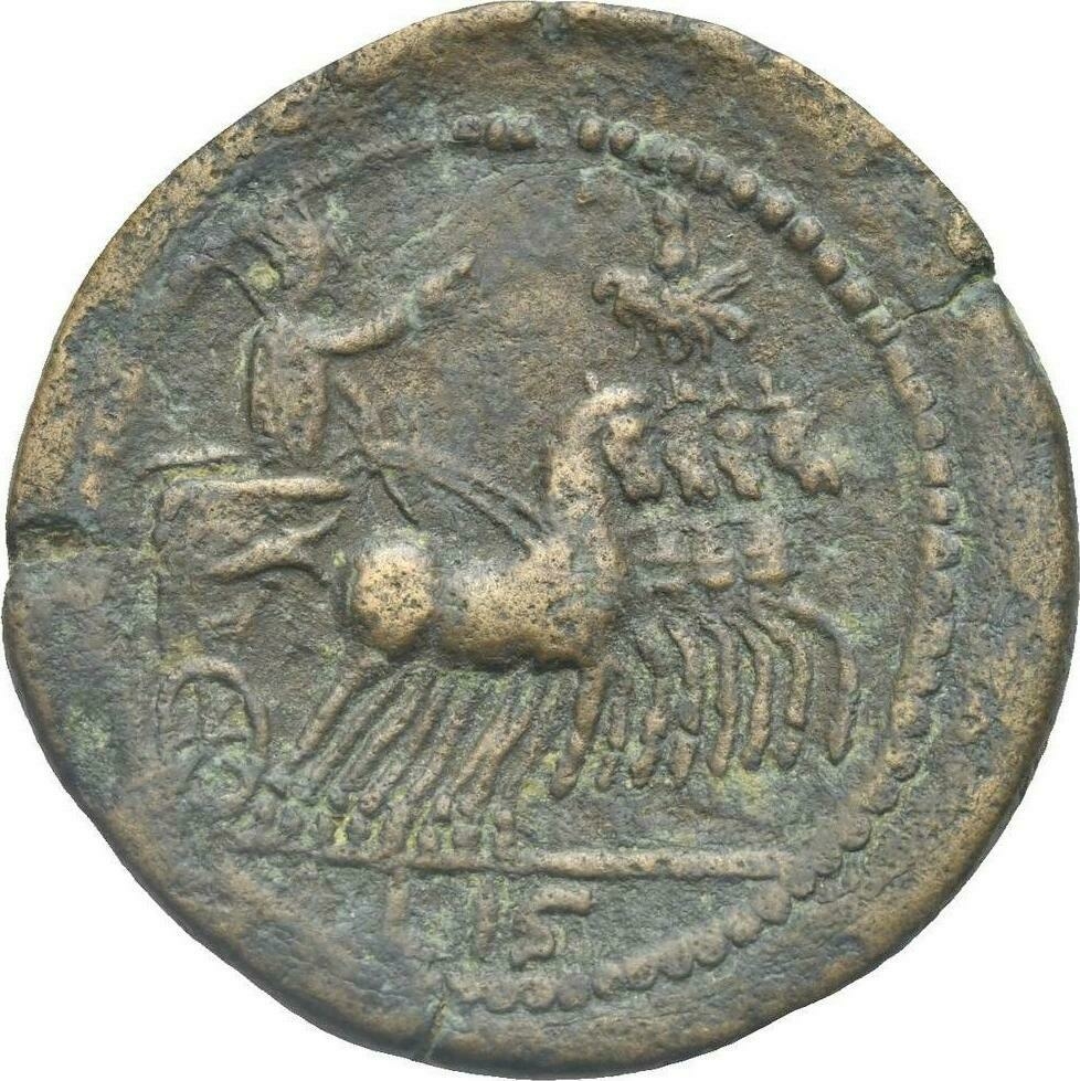 Emperor (Trajan) standing in quadriga, right, laureate-headed, wearing toga, holding eagle-tipped sceptre and branch; above figure on eagle