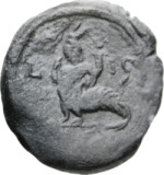 Harpocrates of Canopus with crocodile body, standing on basis, left, raising finger to lips and holding cornucopia