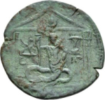 ‘Portico having four columns supporting pediment, within which two figures of Nike holding wreath between them; within, statue of Agathodaemon, facing, in form of man, with below the waist of serpent; wears kalathos and himation, and holds in each hand a kind of sistrum. (temple of Agathodaemon.)’ ‘Date effaced’ (BMC). She probably holds two torches