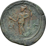 Athena standing, left, holding ears of corn, and spear and shield