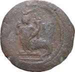 Reverse design Harpocrates with crocodile body standing, left, raising finger to lips and holding cornucopia; to left, altar