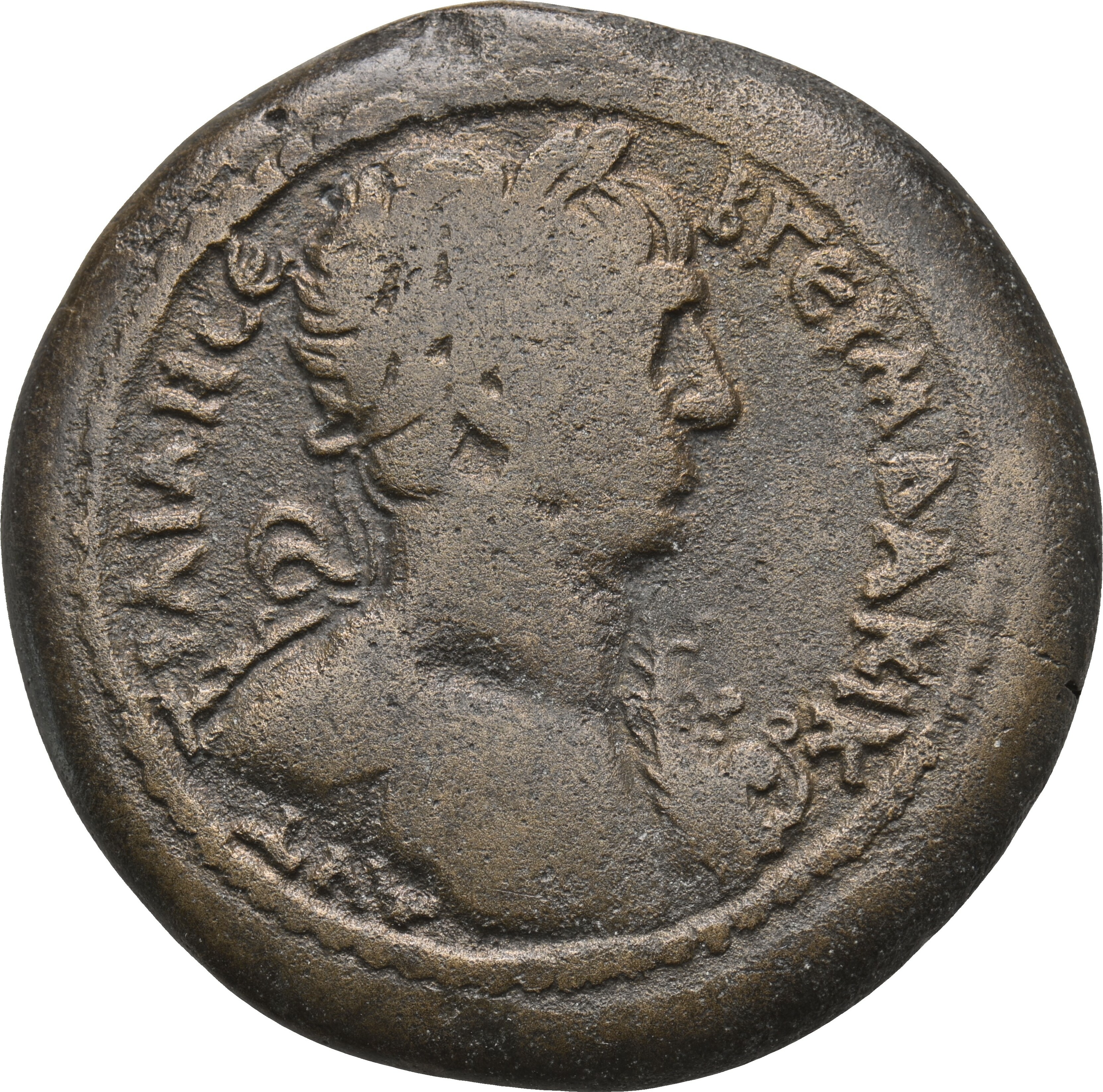 laureate half-length nude bust of Trajan, right, with aegis on, left, shoulder |