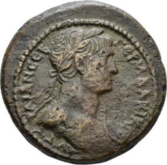 laureate half-length nude bust of Trajan, right, with aegis on, left, shoulder |