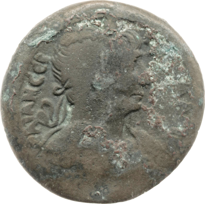 laureate half-length nude bust of Trajan, right, with aegis on, left, shoulder |