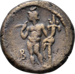 Harpocrates standing facing, head left, raising finger and holding cornucopia, and leaning on column
