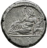 Nilus reclining left, holding reed and cornucopia; below, hippopotamus