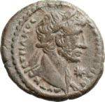 laureate head of Hadrian, right, drapery on left shoulder; to right, star |