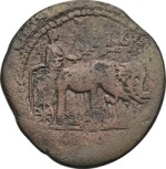 Emperor (Hadrian) standing in elephant quadriga, right, laureate-headed, wearing toga, holding eagle-tipped sceptre and branch