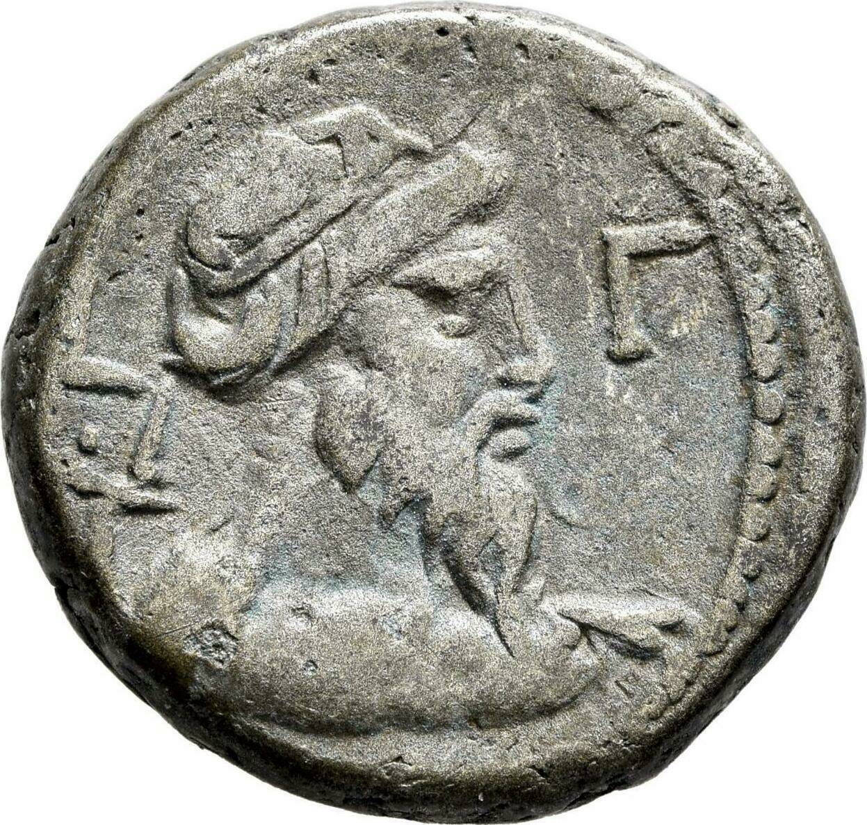 draped bust of Nilus, right, crowned with taenia and lotus-buds, cornucopia at shoulder