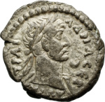 laureate head of Hadrian, right, drapery on left shoulder; to right crescent