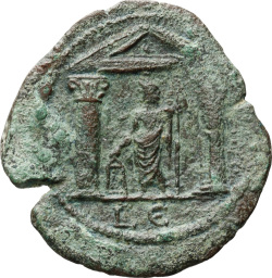 temple (classical) with two columns enclosing Sarapis standing facing, head left, holding sceptre; to left, altar