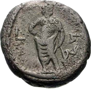 laureate head of Hadrian, right, drapery on left shoulder; to r crescent