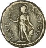 Athena standing facing, head left, holding Nike and shield