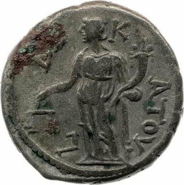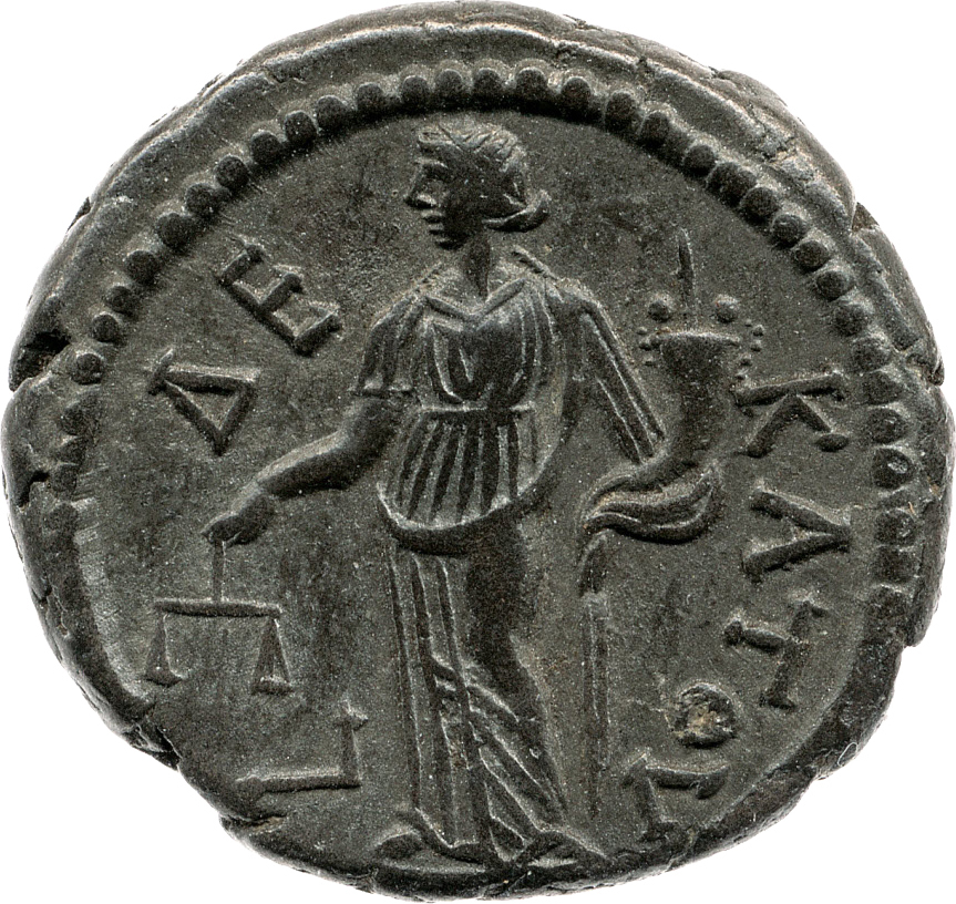 Dikaiosyne standing facing, head left, holding scales and cornucopia