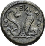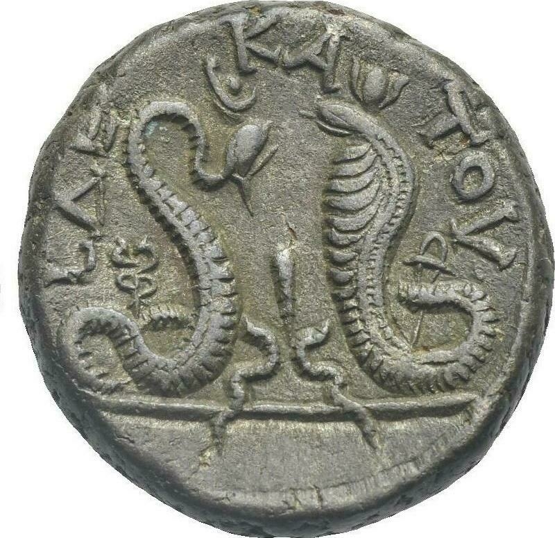 the two serpents are reversed and, the typical winged caduceus of Agathodaemon, is contrasted with an ear of wheat (instead of the sistrum) in the coils of Uraeus.