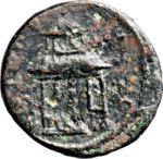 domed two-storey building; lower storey, in which figure standing, left, with four columns; upper storey with four columns