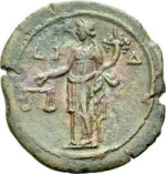 Dikaiosyne standing facing, head left, holding scales and cornucopia