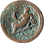 Nilus seated on hippopotamus or crocodile on rocks, left, holding cornucopia and reed; (lotos flowers below)