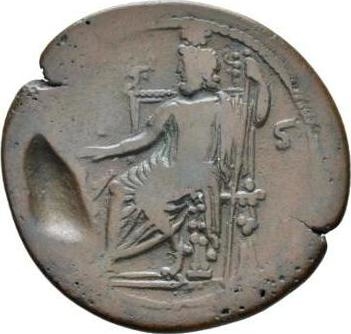 Sarapis seated, left, on throne decorated with two Nikai, holding sceptre; to left, Cerberus