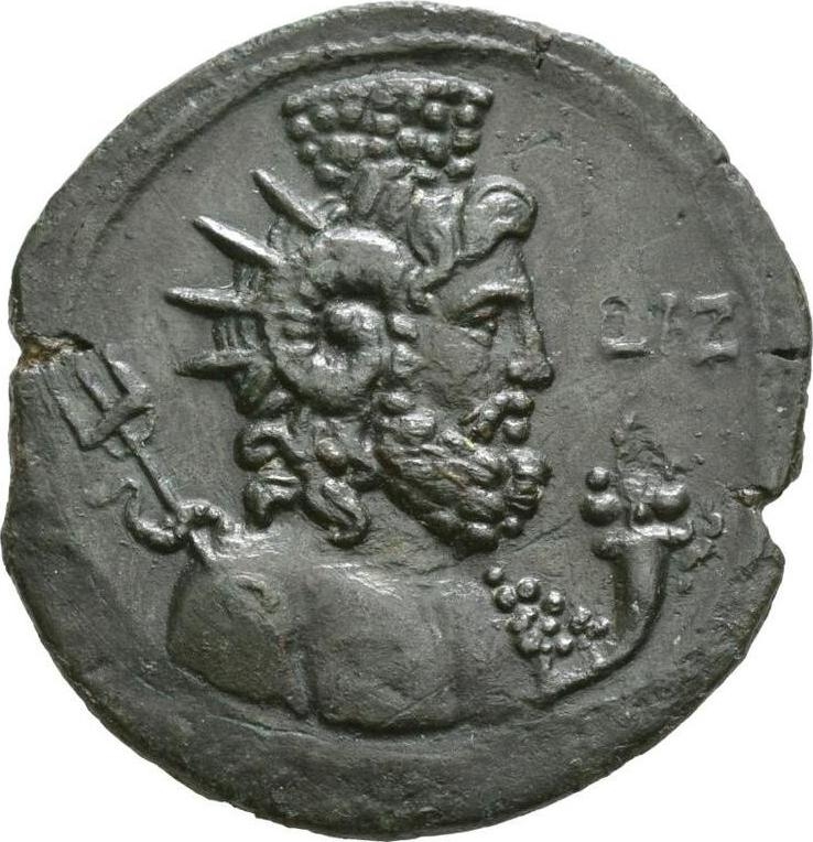radiate bust of Sarapis, wearing kalathos, Ammon horn and laurel wreath; to left, trident; to right, cornucopia