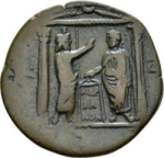 temple (classical) with two columns enclosing Sarapis standing, right holding sceptre and raising arm; to right, Emperor (Hadrian), laureate-headed, wearing toga, standing left, holding sceptre and with hand stretched out over altar; between, altar inscribed ΑΔΡΙΑΝΟΝ |