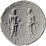 Asclepius resting on serpent-staff with his left hand, his right on his hip, looking right to Hygieia feeding with patera serpent