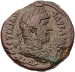 The cornucopia seems to be surmounted with a hawk. The design is perhaps supposed to be the same as the last, but the cornucopia (rather than a club) is very clear. On coins of other years, Harpocrates is depicted sometimes with cornucopia, sometimes with club.