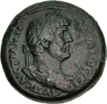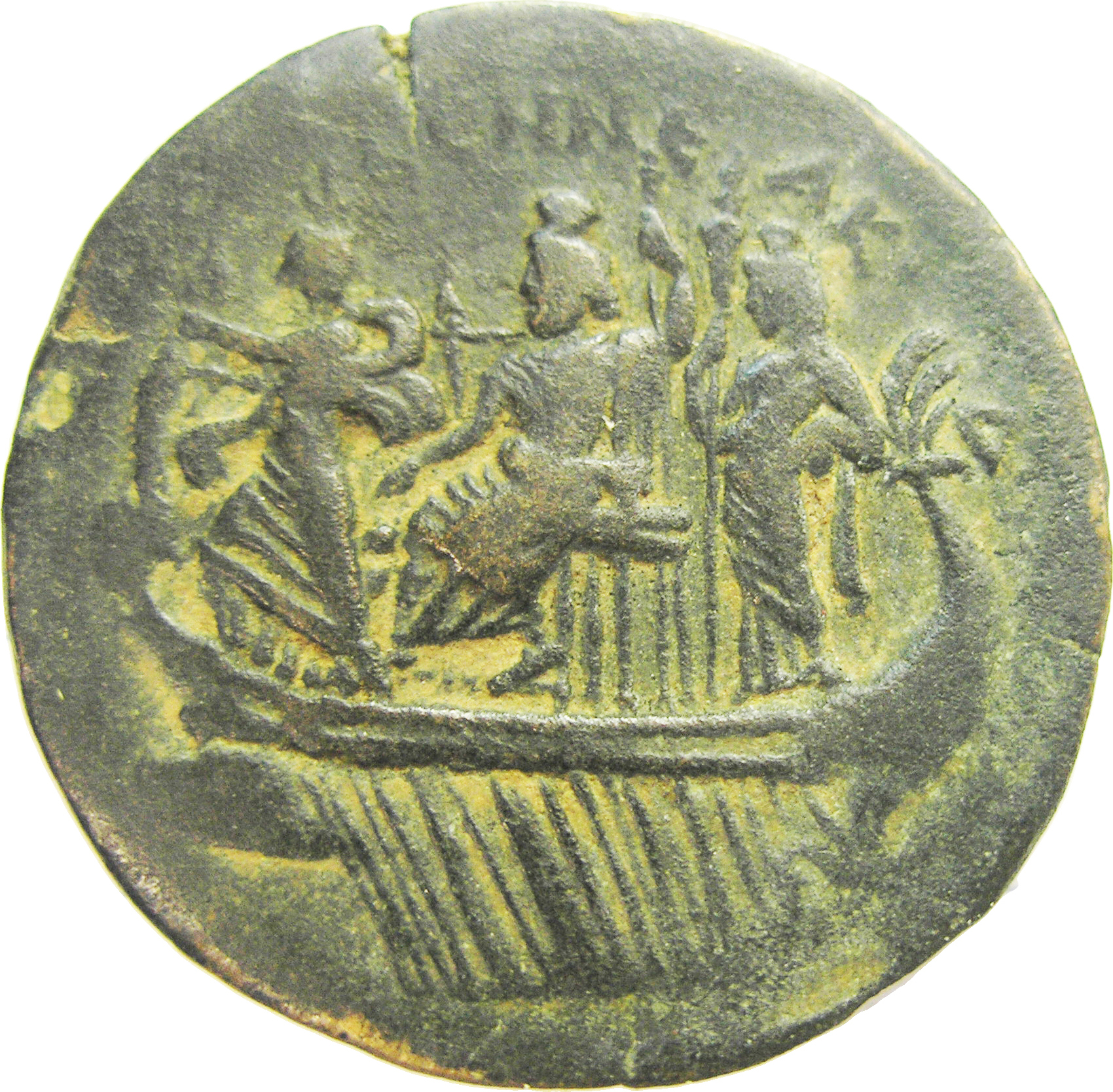 galley with oars, left; Sarapis seated facing, head left, holding sceptre; to left, Isis Pharia standing, left; to right, Demeter standing facing, head left, holding long torch and resting arm on aphlaston