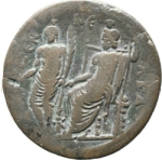 Hermanubis standing, facing, holding caduceus and palm-branch; to right, Sarapis seated, left, holding sceptre; between, Cerberus