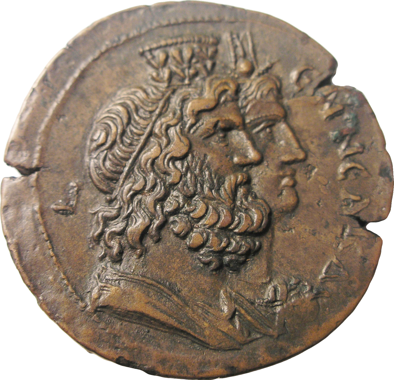 Jugate draped busts of Sarapis, wearing kalathos and laurel wreath, and of Isis, crowned with taenia, disc and horns, right