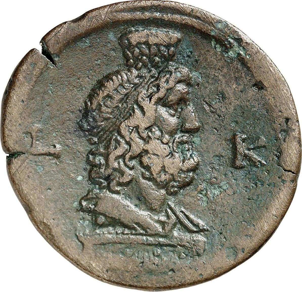 no basis. This coin must be both A. Barb, review of Vogt, NZ 17 (1924), pp. 109-14, at p. 111, no. 33, which is a bronze of Hadrian in V with Zeus Sarapisbüste r., LK; and p. 11 no. 35, which is another bronze ‘Zeus Sarapis B. r., L K’. Presumably a double entry?