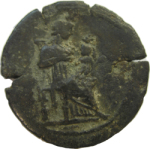 Isis, crowned with disc, horns and plumes, seated right; on knee, Harpocrates, crowned with pschent, raising hand