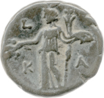 Demeter standing facing, head left, wearing crescent, holding ears of corn and torch