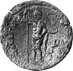 Montou/Apollo standing, left, holding long sceptre in right hand, and Boukhis bull, in left hand