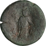 Isis-Outo standing, facing, head left, wearing basileion, holding sistrum in right hand, and ram, right, in left hand