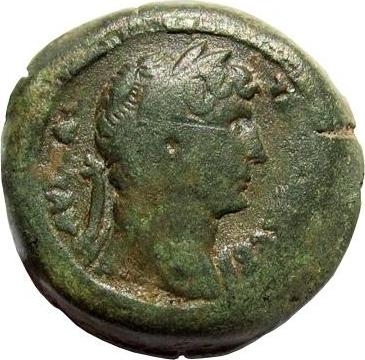 Hathor/Aphrodite standing, facing, head left, wearing feathers between two spurs, holding in right hand figure of Demeter veiled, standing, right, torch in right hand, and something circular in left hand, and in left hand, figure of Isis standing, facing, wearing |