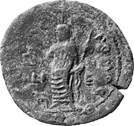 Mout standing, facing, head left, wearing crown with feathers, holding small sceptre in left hand, and ram, right, in right hand; ram, left, at her feet in left field