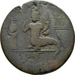 Harpocrates with lower body of a crocodile, standing left, wearing pschent, right hand to mouth, left arm holding cornucopia; two basis decorated with garlands around him; on the front base, hydria; on the base behind, temple with five columns with a frieze of uraei |