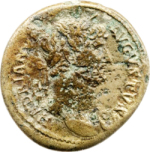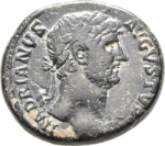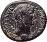Hadrian, in military dress, with cloak floating behind, on horse prancing left, raising his right hand and holding spear in left |