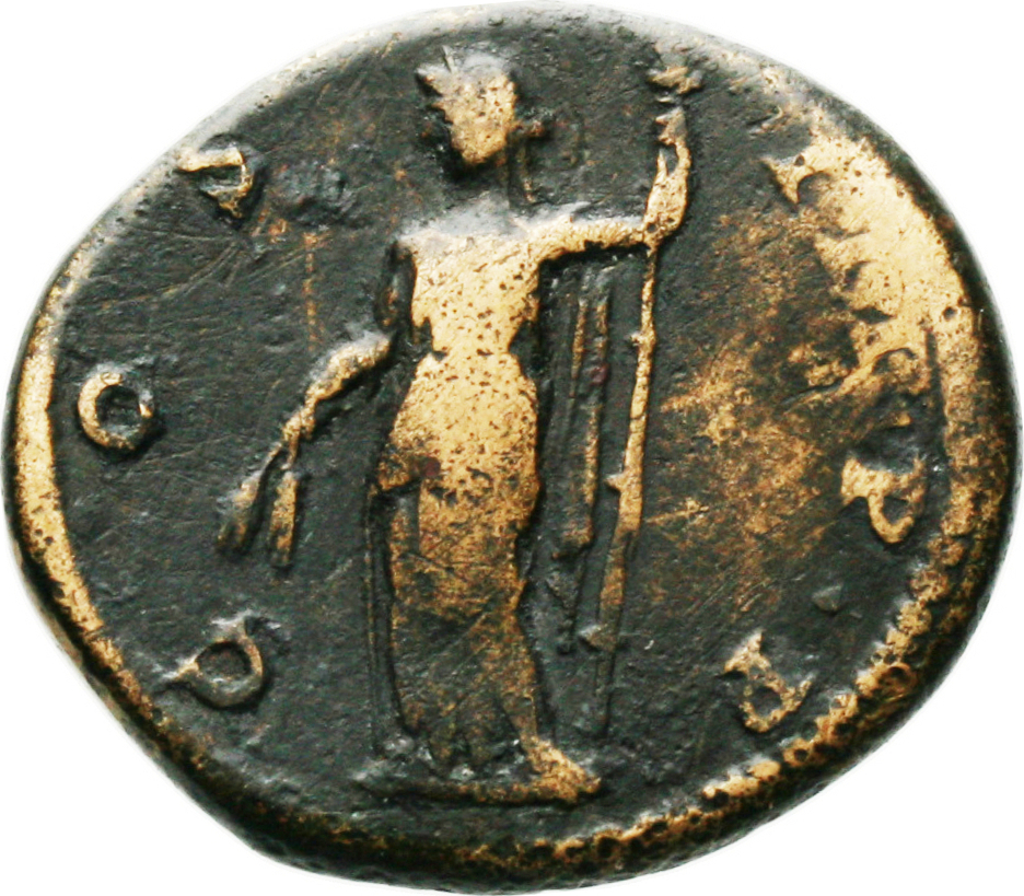 Ceres, veiled, standing facing, head left, holding corn ears in her right hand and long torch in her left